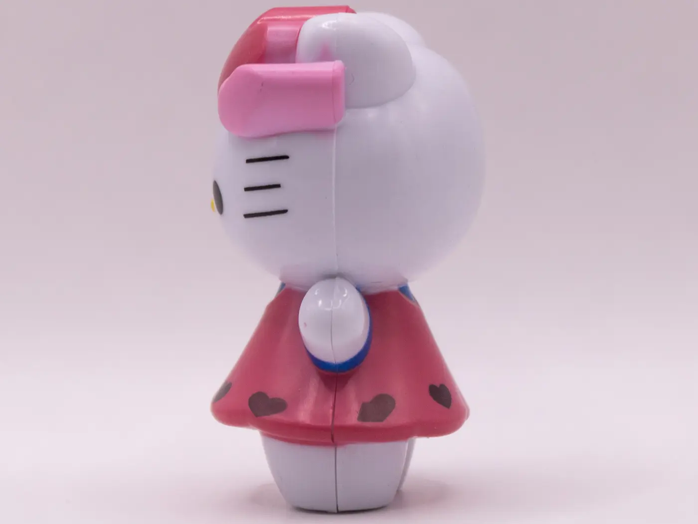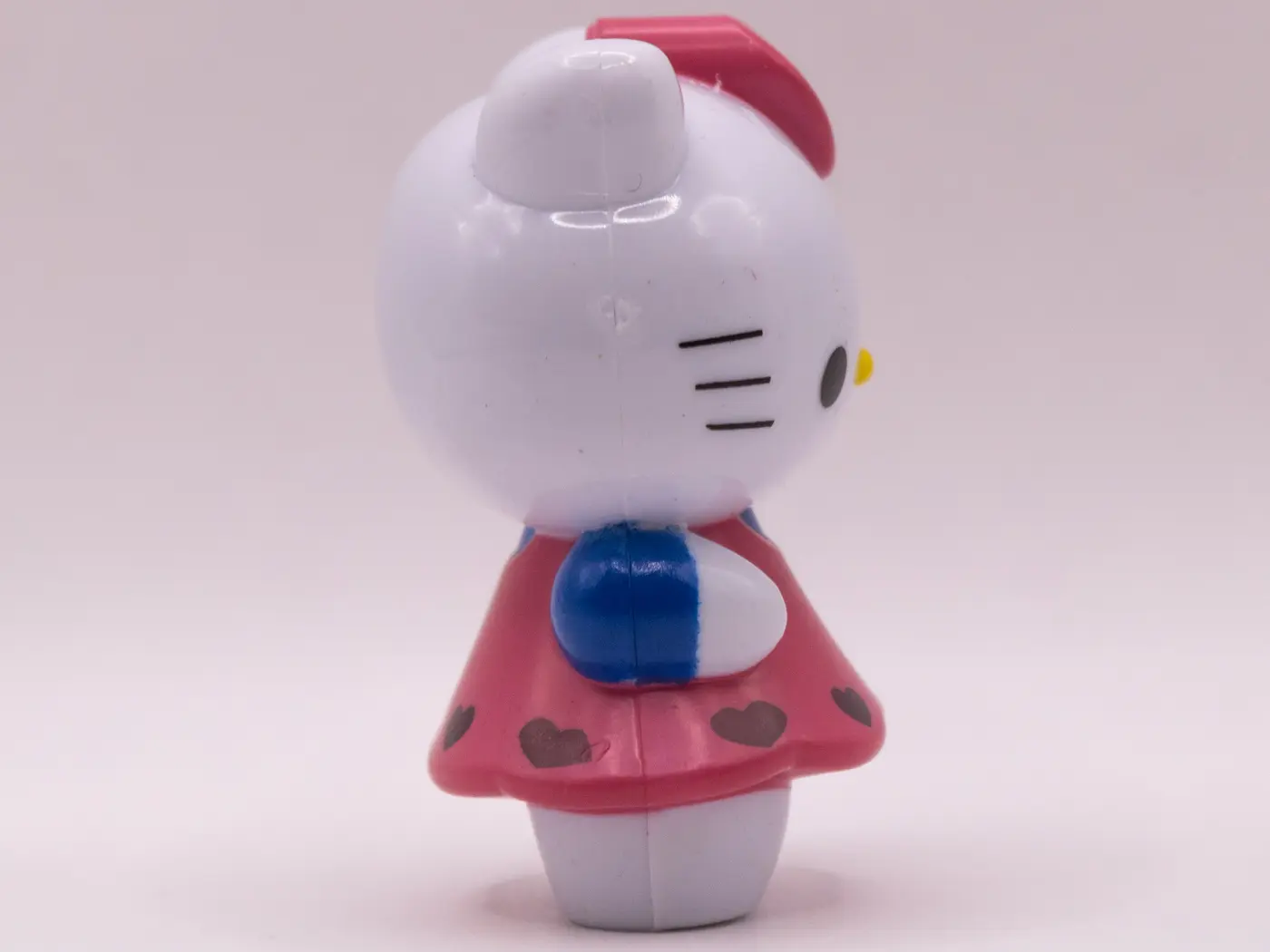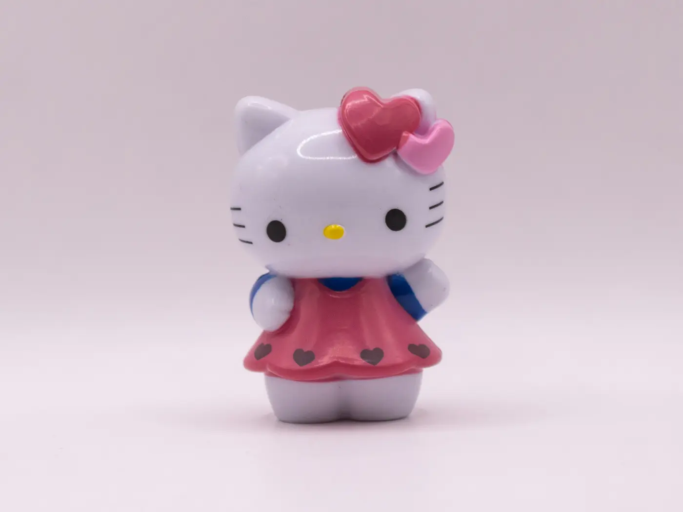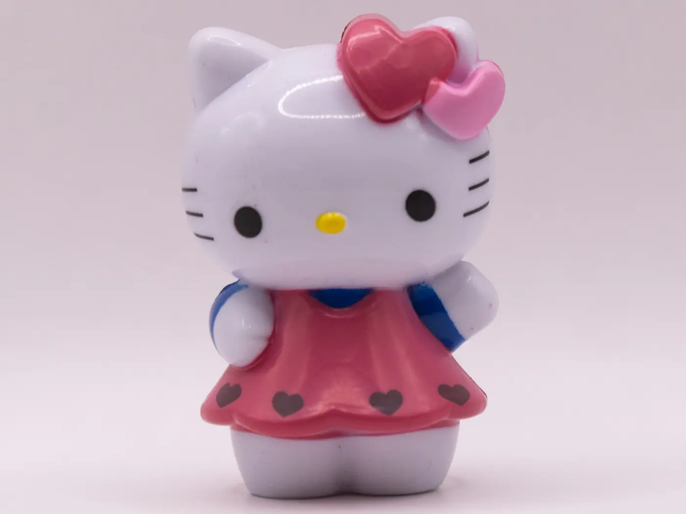 Craquante figurine Hello Kitty vêtue d’une adorable robe rose et de manches bleu ciel ornées d’un cœur. Cette figurine en plastique est un bel objet de collection pour les fans de tous âges.